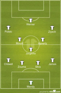 Hakim Ziyech should keep his place on the wing while Christian Pulisic will hope he’s also done enough to keep hold of a first team shirt so Callum Hudson-Odoi may miss out at the King Power.