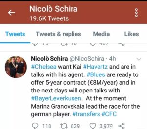 According to a reliable Journalist Nicolo Schira, Chelsea are close to finalizing deal for Kai Havertz signature by opening talks with his agent.