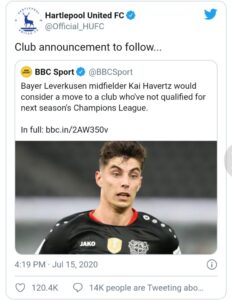 Quote-tweeting the BBC’s original story about Havertz, Hartlepool jokingly posted “Club announcement to follow…”