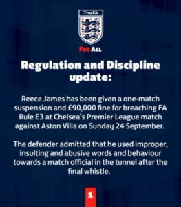 The Body has now handed Reece James one match suspension and £90,000 fine.