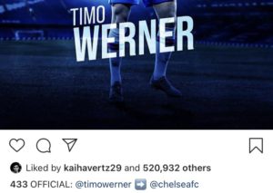 Kai Havertz has sent Chelsea supporters into a frenzy after ‘liking’ a post on Instagram announcing Timo Werner’s move to Stamford Bridge.