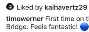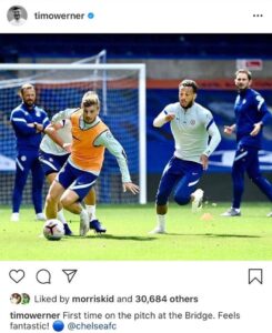 Following yesterday training at Cobham, Chelsea new signing Timo Werner posted a picture on his Instagram page yesterday following a fair play at Stamford Bridge, quoted: “First time at the Bridge Feels Fantastic!” but with no time his German teammates Kai Havertz gives an immediate respond by “Liking” his post.
