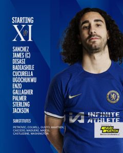 Robert Sanchez keeps his place in goal. Reece James starts, as promised before kick off. It’s a long awaited return for Benoit Badiashile alongside Axel Disasi in central defence. Marc Cucurella plays ahead of Levi Colwill at left back.