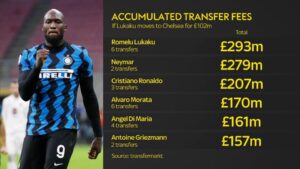 Lukaku’s figure would make him the most expensive player ever ahead of Neymar whose accumulated transfer fees currently stand at £279m.