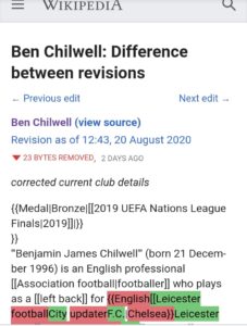 The opening line read: “Benjamin James Chilwell (born 21 December 1996) is an English professional footballer who plays as a left back for Premier League club Chelsea and the England national team.” It has since been reverted back.