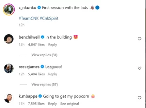 Blues teammates Ben Chilwell and Reece James responded in the comments section. Football star Kylian Mbappe also made a notable appearance.