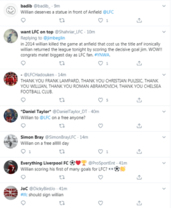 Liverpool fans have moved to appreciate Willian, with some even saying that he deserves a status.