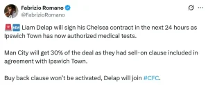 Fabrizio Romano has just Tweeted that Liam Delap “will sign his Chelsea contract in the next 24 hours” and has had a medical with the Blues authorised by Ipswich.
