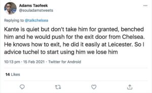 The Chelsea fan warned: “Kante is quiet but don’t take him for granted, benched him and he would push for the exit door from Chelsea.