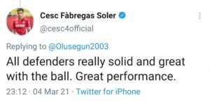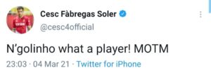 Fabregas tweeted: “N’golinho what a player! MOTM”