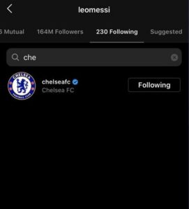 Moments after the news of Messi’s decision to leave Barcelona went viral, a screenshot of the Barcelona forward following English Football Club, Chelsea on Instagram.