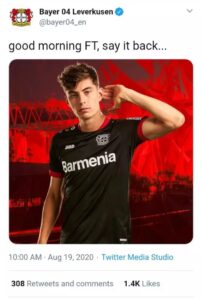 The German Football Club Bayern Leverkusen Posted a Photo of their star player Kai Harvetz on the Club Official Twitter account this morning and the photo has generated a lot of Reactions from fans.
