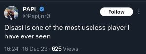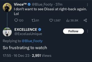Chelsea recovered from a flat showing in the first half, which ended goalless, to dominate the encounter and stroll to a win in front of their fans. Goals in the second half from Cole Palmer (54′) and Nicolas Jackson (61′) gave them a fully deserved win.Some Blues’ fans, though, were unhappy with the performance of makeshift right-back Axel Disasi and took to X (formerly Twitter) to air their thoughts, writing: