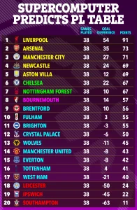 Finally, the Supercomputer predicts Man Utd and Tottenham to finish 14th and 16th respectively.