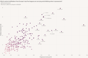 Over 200 central midfielders have accumulated over 1,000 minutes in Europe’s top five leagues this season, with Kovacic showing up impressively for dribbles completed combined with progressive carries per 90, shown below.