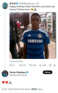 “Happy birthday Victor Osimhen, pls come and rescue Chelsea soon,” the message read.